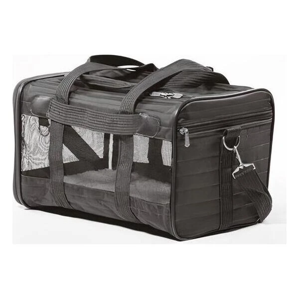 Er zijn twee ingangen voorzien: één aan de zijkant en één aan de bovenzijde. De tas is daarbij uitgerust met een vergrendelbare rits, een gewatteerde draagriem en een gordel/bagageriem. Het zachte kussen aan de binnenzijde zorgt voor een knusse rustplaats voor jouw geliefde viervoeter tijdens de reis.