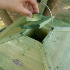 De voederring heeft een metalen regenkap en een ophanghaak. Dankzij het zeer stevige doorzichtige plexiglas kun je van binnenshuis zien hoeveel voeder er nog in de silo zit.