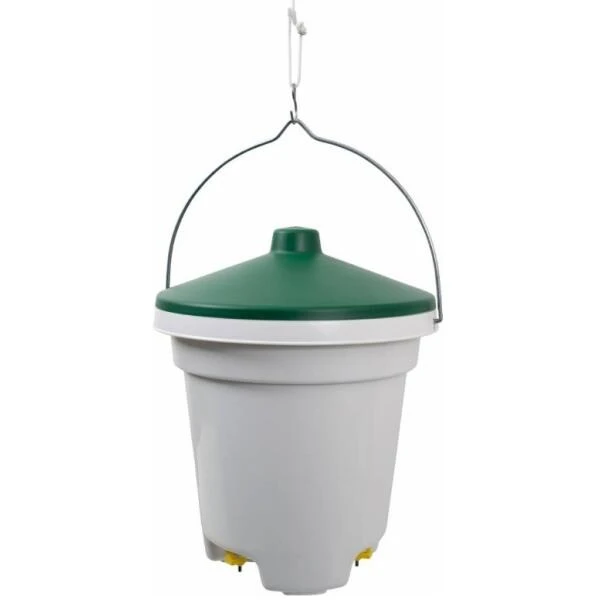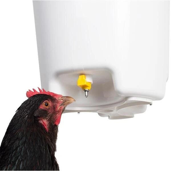 Het water in het afgesloten reservoir blijft steeds vrij van ziektekiemen. De kippen, fazanten of ander pluimvee kunnen het water opnemen via drie nippels. De emmer wordt geleverd als complete set met drie drinknippels, een deksel en een stevige hangbeugel.