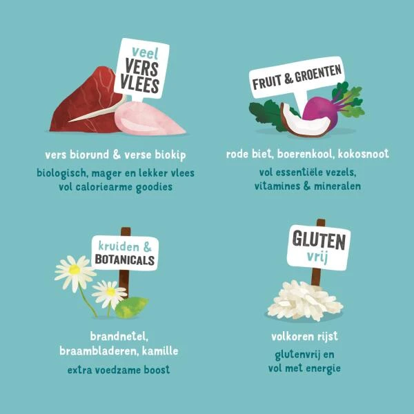 Deze glutenvrije brokken zitten boordevol vers biorund én bioscharrelkip (zonder gedroogd of gedehydreerd vlees). Daardoor is dit recept uitzonderlijk rijk aan hoogwaardige eiwitten. Wist je dat biodieren meer vrije uitloop en frisse lucht hebben? En dat doet hen goed.