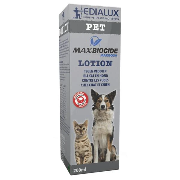 Max Biocide lotion is een ecologisch product met een repulsief effect tegen vlooien bij honden en katten. Onmiddellijk na het toepassen op de huid verspreiden de natuurlijke bestanddelen zich op de pels van het dier en vormen zo een beschermende film tegen de aanvallen van ectoparasieten.