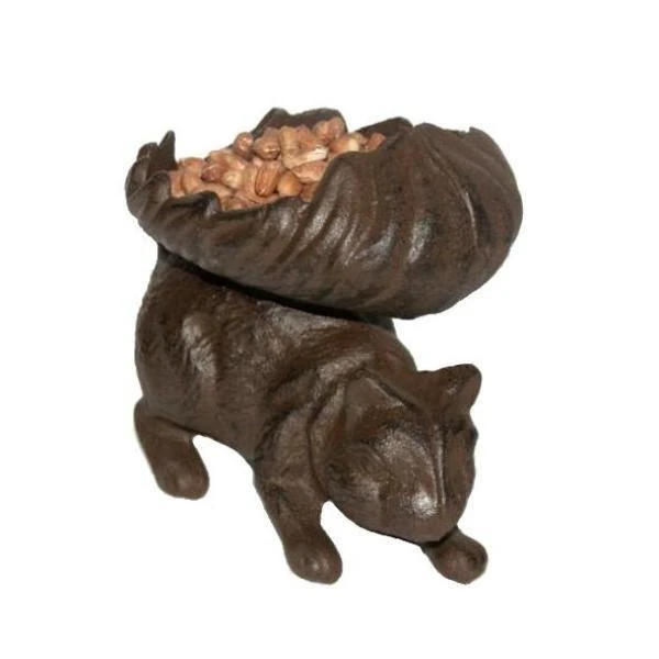 Deze gietijzeren eekhoorn heeft een holle pluimstaart die dienst doet als schaaltje waarin je zowel voeder als water kan geven. Dit schaaltje combineert functionaliteit en decorativiteit.