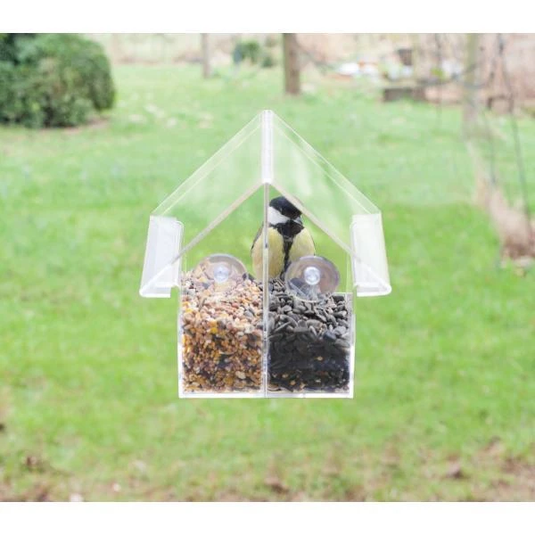 Leuke transparante raamvoedersilo waarin je twee soorten voeding kan aanbieden. De silo, in de vorm van een huisje, is voorzien van twee zuignappen en een afneembaar dakje. Dankzij dit dakje kan je de silo gemakkelijk bijvullen en blijft het voedsel droog.