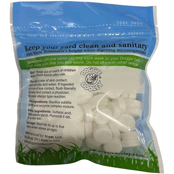 Speciaal verteringstabletten voor het biologisch afbreken van hondendrollen. Speciale formule om huisdierenuitwerpselen af te breken. De enige tabletten voor het beste resultaat in jouw verteerkuip. Iedere tablet bevat duizenden efficiënte micro-organismen die het verteringsproces van organisch afval met zienderogen versnellen. De tabletten zijn milieuvriendelijk en niet giftig. De enzymen zijn biologisch afbreekbaar tot onschadelijke aminozuren.