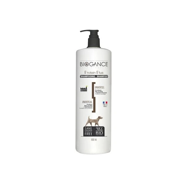 De Biogance Protein Plus universele hondenshampoo is samengesteld uit havermelk, zijde- en rijstproteïnen voor een zachte reiniging.