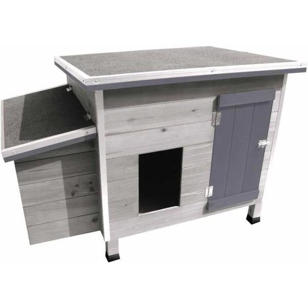 Compact kippenhok met legnest. Dit hok in grenenhout is grijs gebeitst en geschikt voor een drietal kippen. De hoeken van dit hok en de dakrand zijn afgewerkt in aluminium en de vier poten zijn bekleed met rubber voor een langere levensduur.