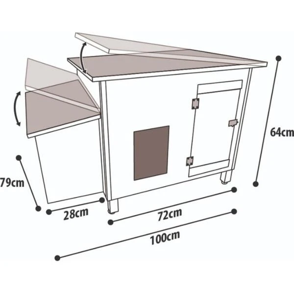 Zowel het dak van het legnest, als het dak van het kippenhok zijn afgewerkt met dakleer. Beide daken lopen schuin af voor een goede afwatering. Er is ook een draaideur in de voorzijde van het kippenhok zodat je het gemakkelijk kan reinigen.