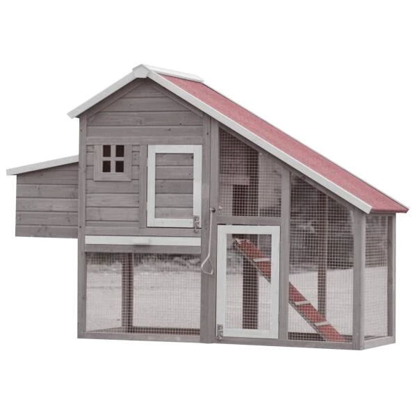 Het hok heeft een afsluitbaar, volledig overdekt buitenren dat onder het nachthok doorloopt. Het nachthok is bereikbaar via een loopplank en beschikt over een legnest.