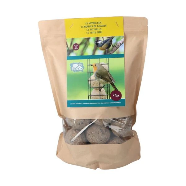Een set van 15 mezenbollen zonder netje verpakt in een duurzame verpakking. Ideaal om in een vetbolhouder aan te bieden want dan zijn de netjes overbodig.