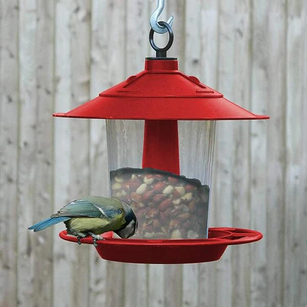 De vogels kunnen vanaf de voorziene zitrand de zaden uit het opvangbakje oppikken. De voedersilo is makkelijk aan te vullen door de opening van het dak. Draai hiervoor het dak naar links of naar rechts.