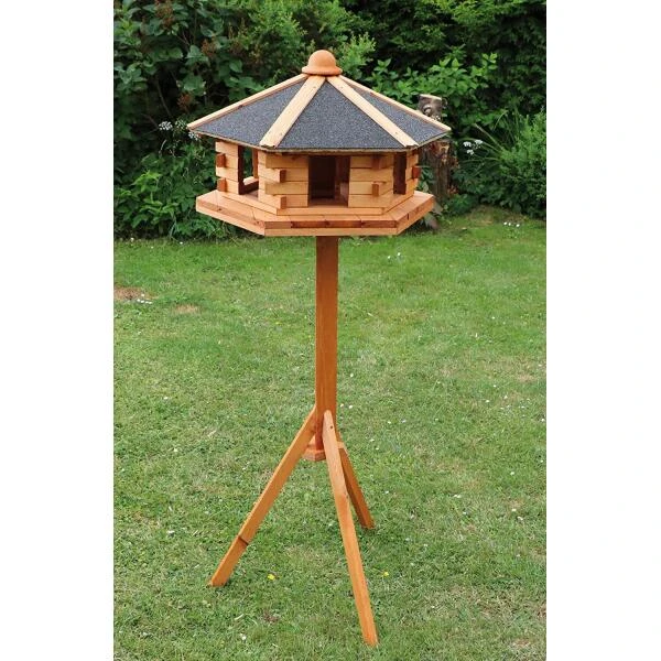 Het grote dak in bitumen beschermt het voeder en maakt het vogelvoederhuis tot een mooi afgewerkt geheel wat een meerwaarde geeft aan elke tuin. De statief zorgt daarbij voor voldoende stabiliteit. Plaats de voedertafel bij voorkeur op een beschutte plaats, in de buurt van struiken of bomen zodat de vogels zich veilig voelen.