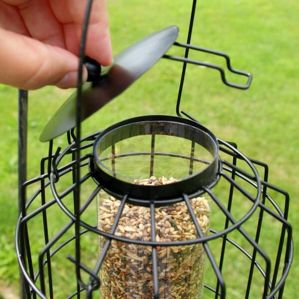 Dankzij de kooi omheen de zaadsilo, kruipen enkel de kleinere tuinvogeltjes doorheen de mazen tot bij het voer. Zo geniet je veel langer van de vele kleine vogeltjes die op en af vliegen naar hun geliefde zaadmengsel waar ze rustig eten. Hierdoor hoeven ze zich ook geen zorgen te maken over roofvogels of katten die op de loer liggen.